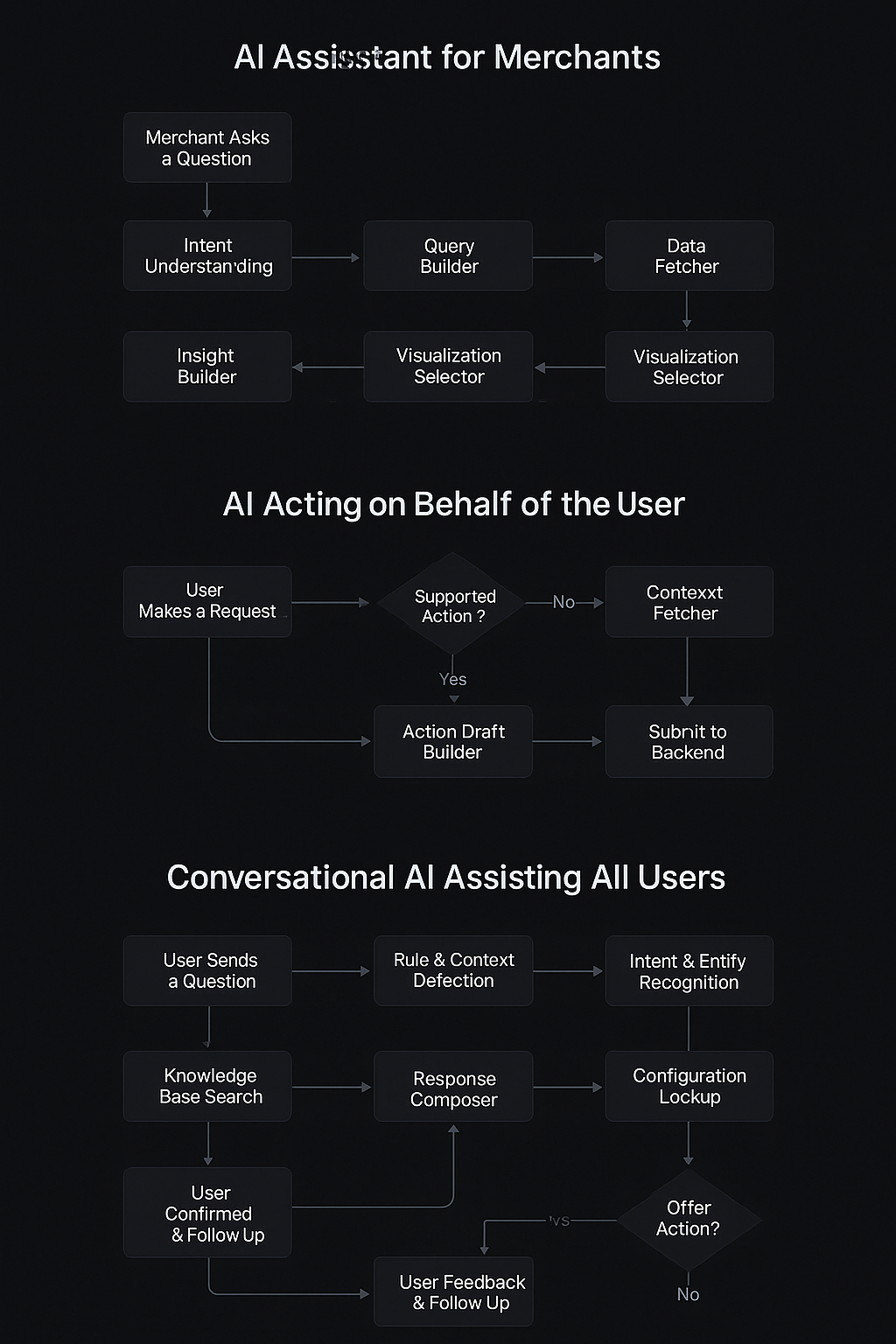 The platform featured three major AI systems each serving a different audience and purpose. Together, they reshaped how merchants make decisions, how customers get help, and how support teams operate.